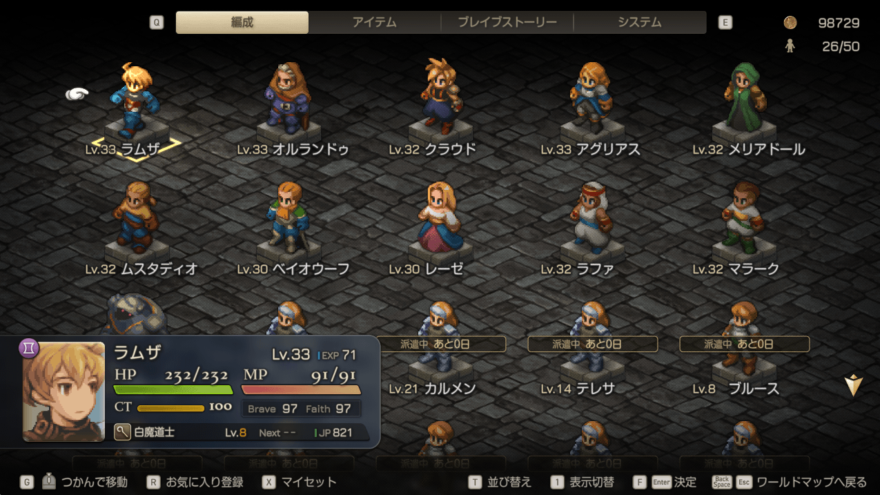感想を見て回っても、FFT既プレイの人がジョブチェンジの方法が分からなくてずっと初期ジョブで進めてて砂ネズミで詰まっててそこでやっとジョブチェンジできることを知ったとかいうのも見ました。確かにUI階層が分かりづらいです。